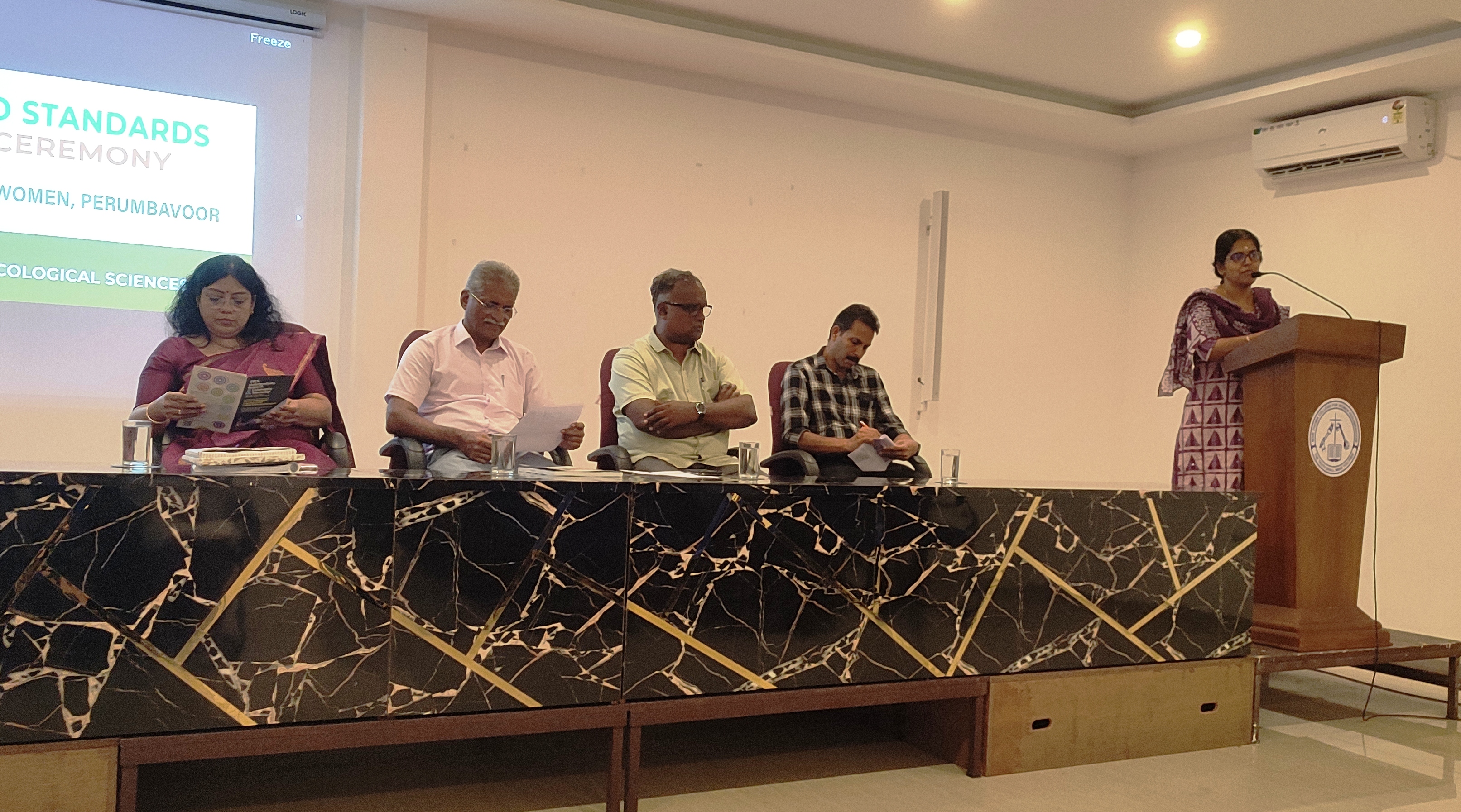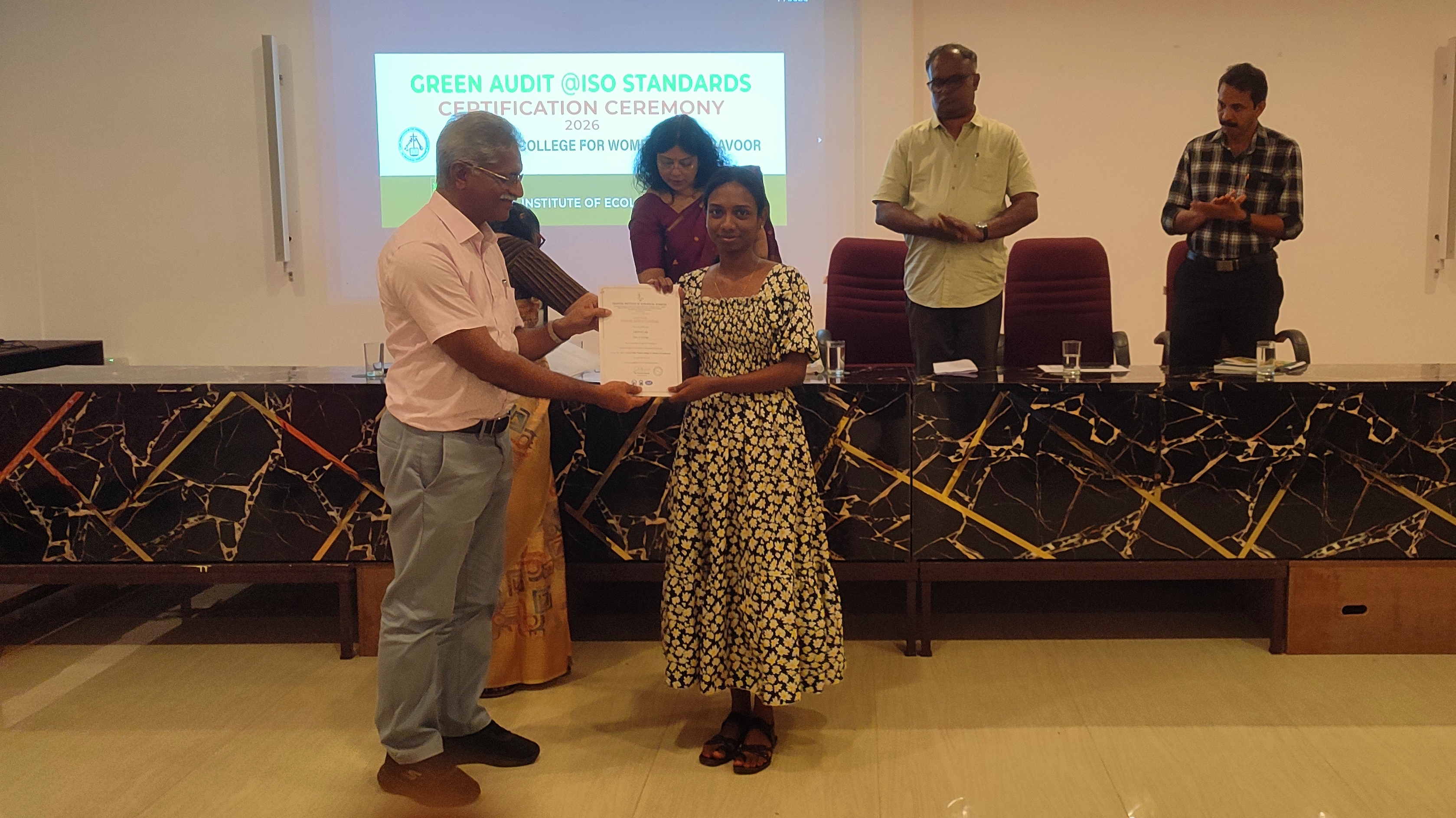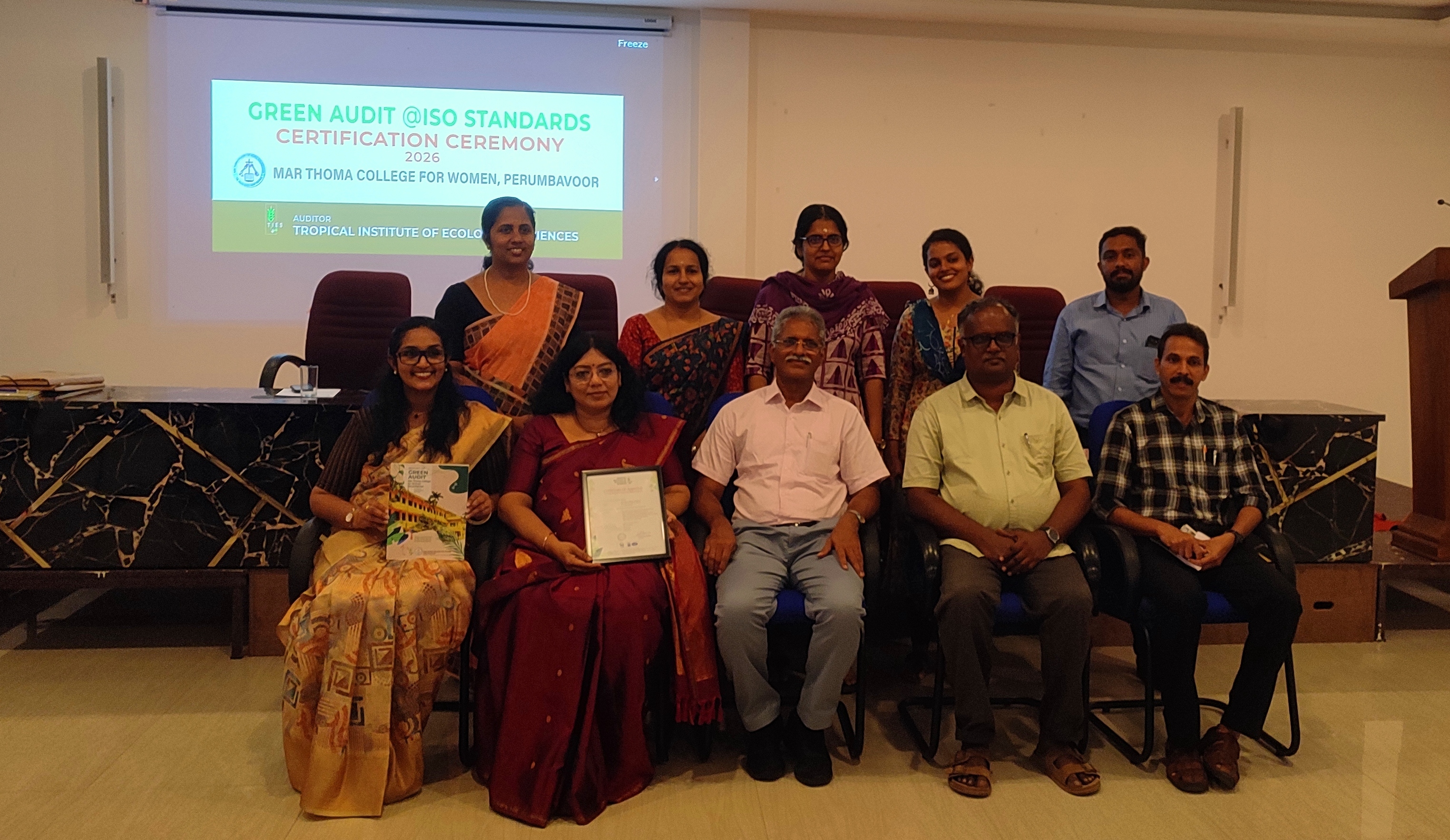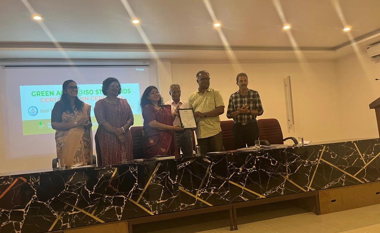 Mar Thoma College for Women, Perumbavoor, achieved a significant step in environmental sustainability with its Green Audit Certification observing ISO standards and the formal release of the Green Audit Report on 26 March 2026 at 2 P.M. in the P.G. Seminar Hall. The audit, conducted by the Tropical Institute of Ecological Sciences (TIES), addressed all non-conformities through certified internal auditors, ensuring full ISO compliance. The Green Audit assessed the college’s key sustainability areas: Environmental Management System (EMS – ISO 14001), Energy Management System (EnMS – ISO 50001), Water Efficiency Management System (WEMS – ISO 46001), Waste Management System (WMS – ISO 14001), Biodiversity Management System (BMS – ISO 14001), Carbon Footprint (ISO 14067), and Occupational Health & Safety (OHS – ISO 45001),reflecting the college’s integration of sustainability into academic, administrative, and operational practices. The program began with a prayer song and a welcome address by EMS Coordinator Mrs. Reemy Sara Mathai. Prof. (Dr.) Letha P. Cheriyan, Principal, presided, while audit division coordinators Dr. Anupama P. (EnMS), Sherin T. Abraham (WEMS), Dr. Jijo Jayaraj (WMS), Mrs. Sunu N.V (BMS), and Mrs. Seira Susan Prasad (OHS) shared insights from the audit. Dr. Punnen Kurian, Director of TIES, outlined the audit methodology and ISO compliance. The Green Audit Certificate was presented to the Principal by Dr. Abraham Samuel, President of TIES, and Dr. Punnen Kurian. Dr. Abraham Samuel addressed the gathering on the importance of sustainable practices. The Green Audit Report was released, and certificates for internal auditors were distributed. Ananya Palakka, Project Manager, Green Audit, and Josepha Priyanka Barla from TIES were also in attendance, witnessing the event and acknowledging the college’s collaborative efforts. Prof. (Dr.) Vineedkumar K., IQAC Coordinator, delivered the vote of thanks, and the ceremony concluded with the National Anthem. With a current carbon footprint of 14.83 kilograms per person, the institution aims to reduce it to less than 10 kilograms per person within a year. This ambitious target marks a very important step toward a greener campus, reflecting a strong commitment to environmental responsibility and sustainable practices.