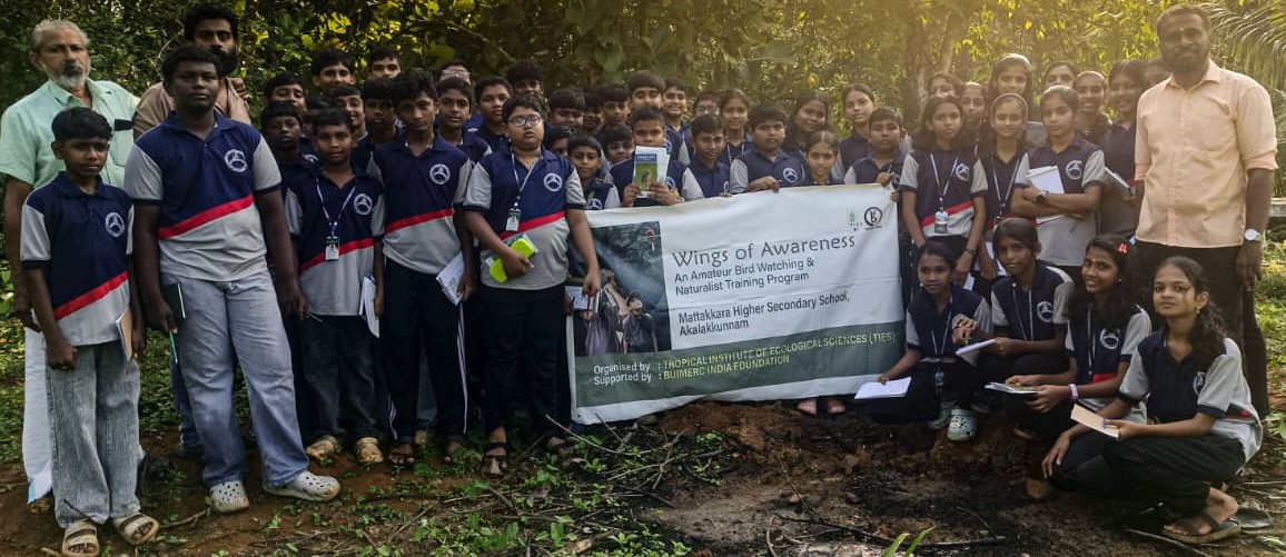 The Wings of Awareness programme, an educational initiative of the Tropical Institute of Ecological Sciences (TIES) conceived and supported by Buimerc India Foundation, conducted a bird-watching session at Mattakkara Higher Secondary School in Kottayam district, Kerala. Designed to foster deeper engagement with the natural environment, the activity offered students a chance to observe birdlife thriving around their own campus and encouraged them to connect more closely with the biodiversity in their daily surroundings. The project is implementing across 20 schools in Kottayam District, engaging around 1,000 students and 60 teachers.