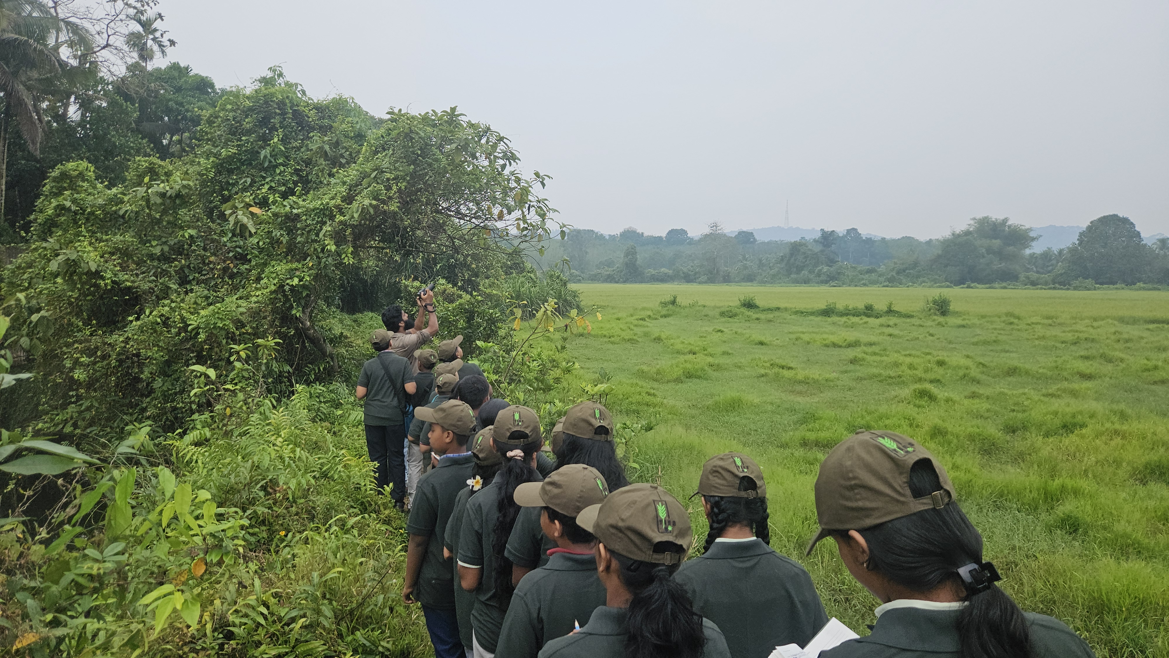 The field observations began along the margins of the paddy fields, where students recorded notable sightings including Grey-headed Swamphens actively foraging. Elusive Pheasant-tailed Jacanas were spotted within the wetland vegetation, while Black-headed Ibises, Purple Herons, and cormorants were observed in flight and at rest. As the group progressed along the trail, Zitting Cisticolas were seen moving swiftly across the fields, and students experienced a close and clear sighting of a Common Kingfisher. The session concluded near an active cluster of Baya Weaver nests, providing an opportunity to observe nesting behaviour and colony structure. A total number of 56 different species of birds were observed by the team.