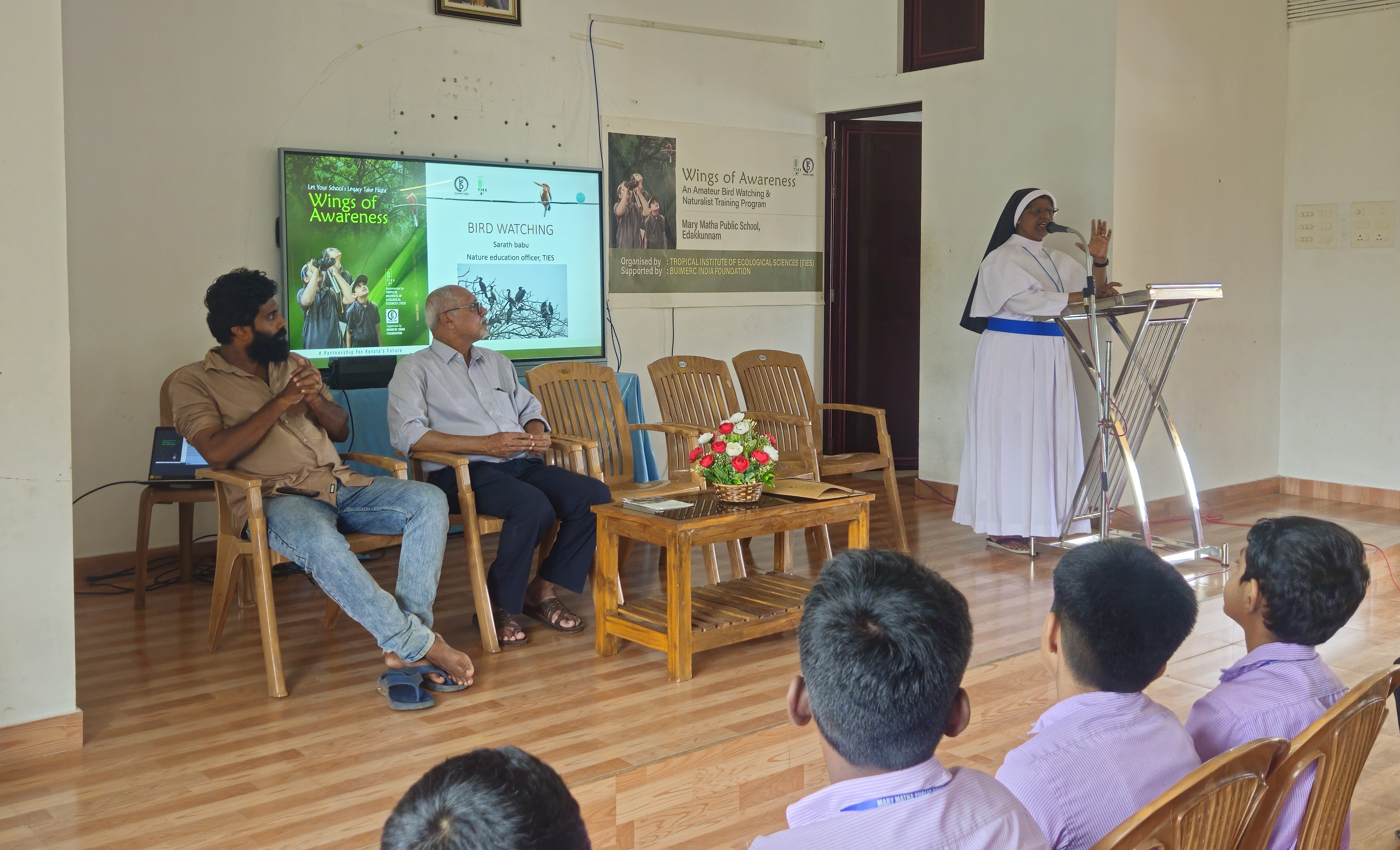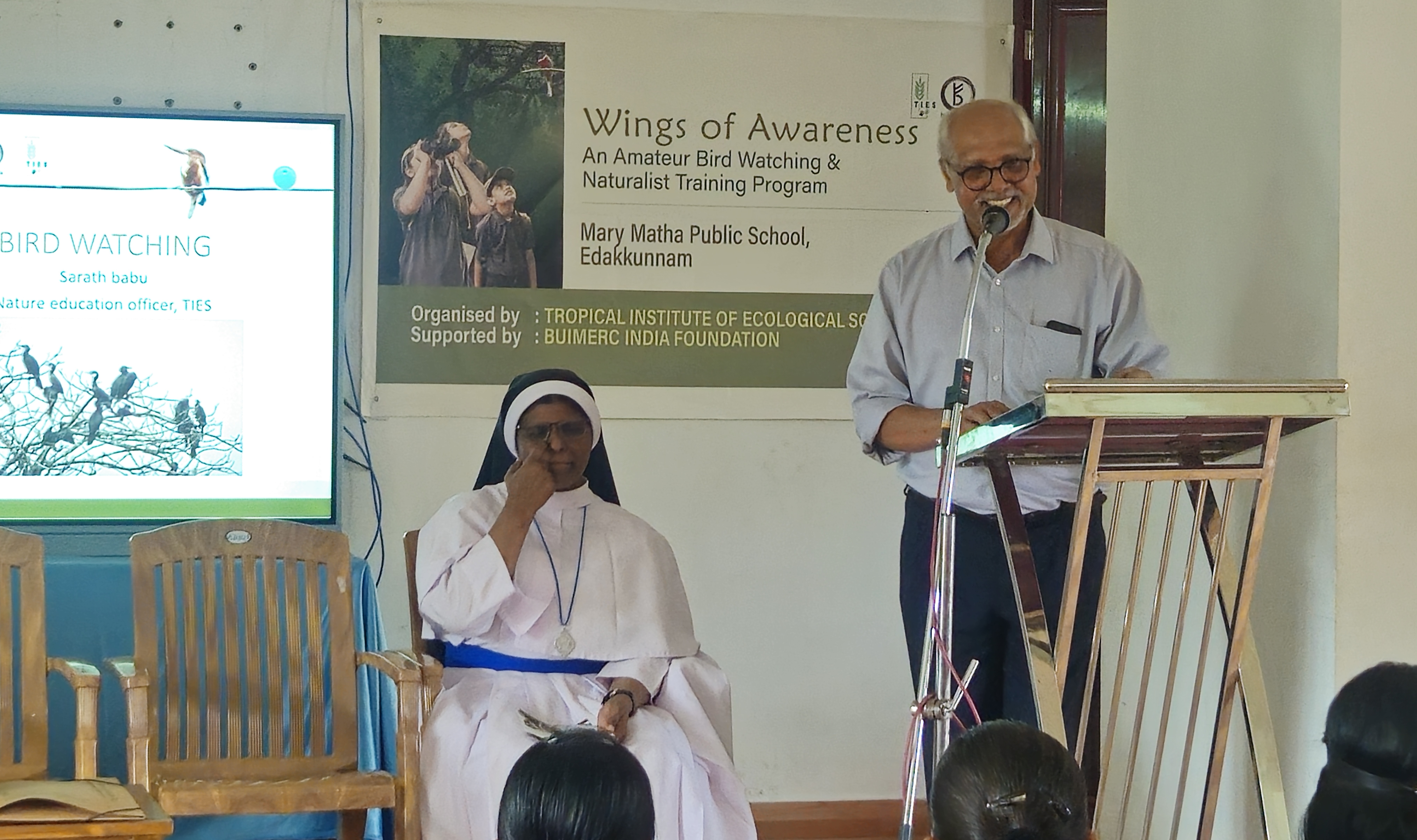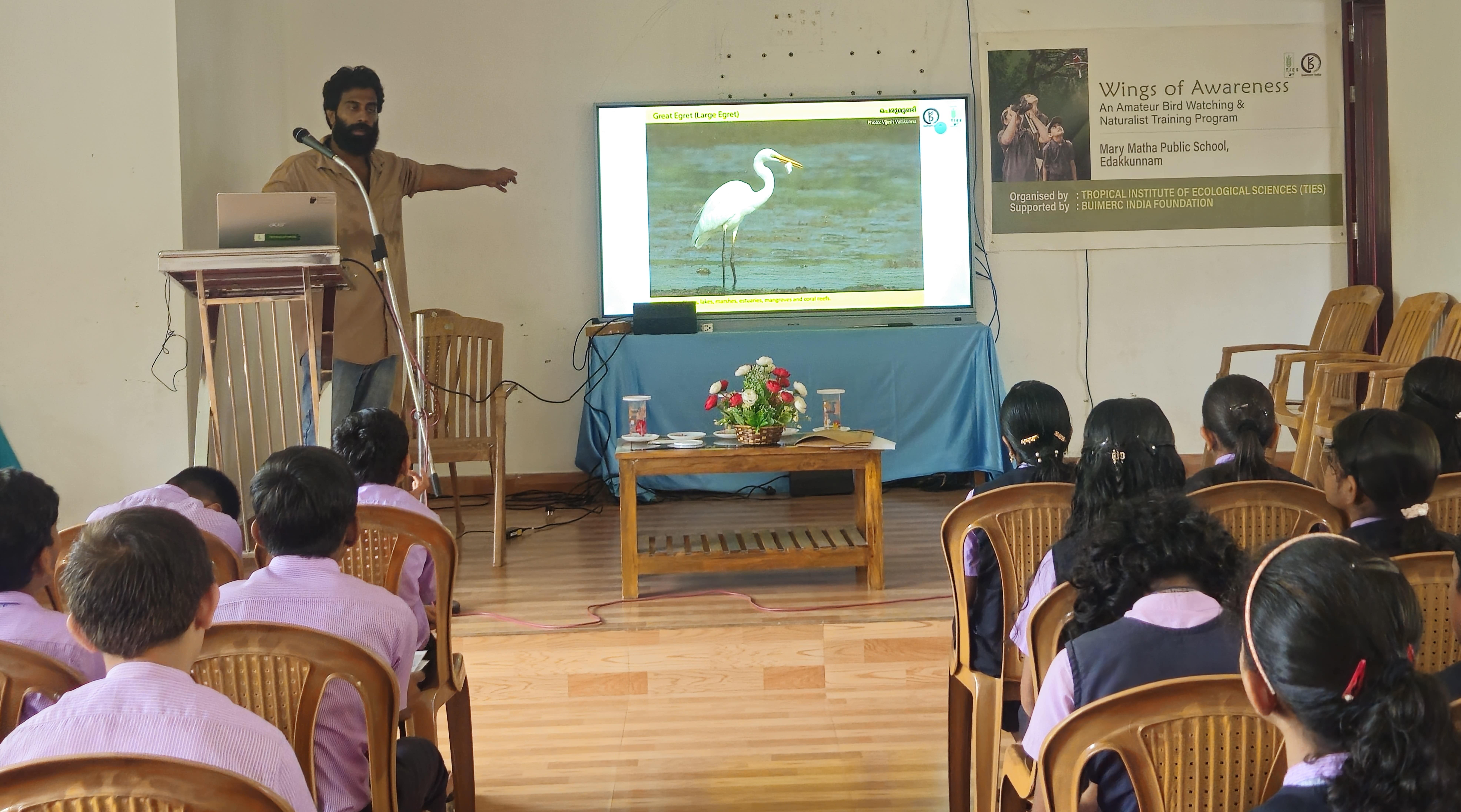 The Wings of Awareness orientation session was conducted at Mary Matha Public School, Edakkunnam, as part of the district-wide initiative organized by the Tropical Institute of Ecological Sciences (TIES) conceived and supported by Buimerc India Foundation. The programme is designed to inspire students to connect with nature through bird watching and naturalist training, nurturing environmental awareness and conservation values among young learners. The project will be implemented across 20 schools in Kottayam District, engaging around 1,000 students and 60 teachers.
