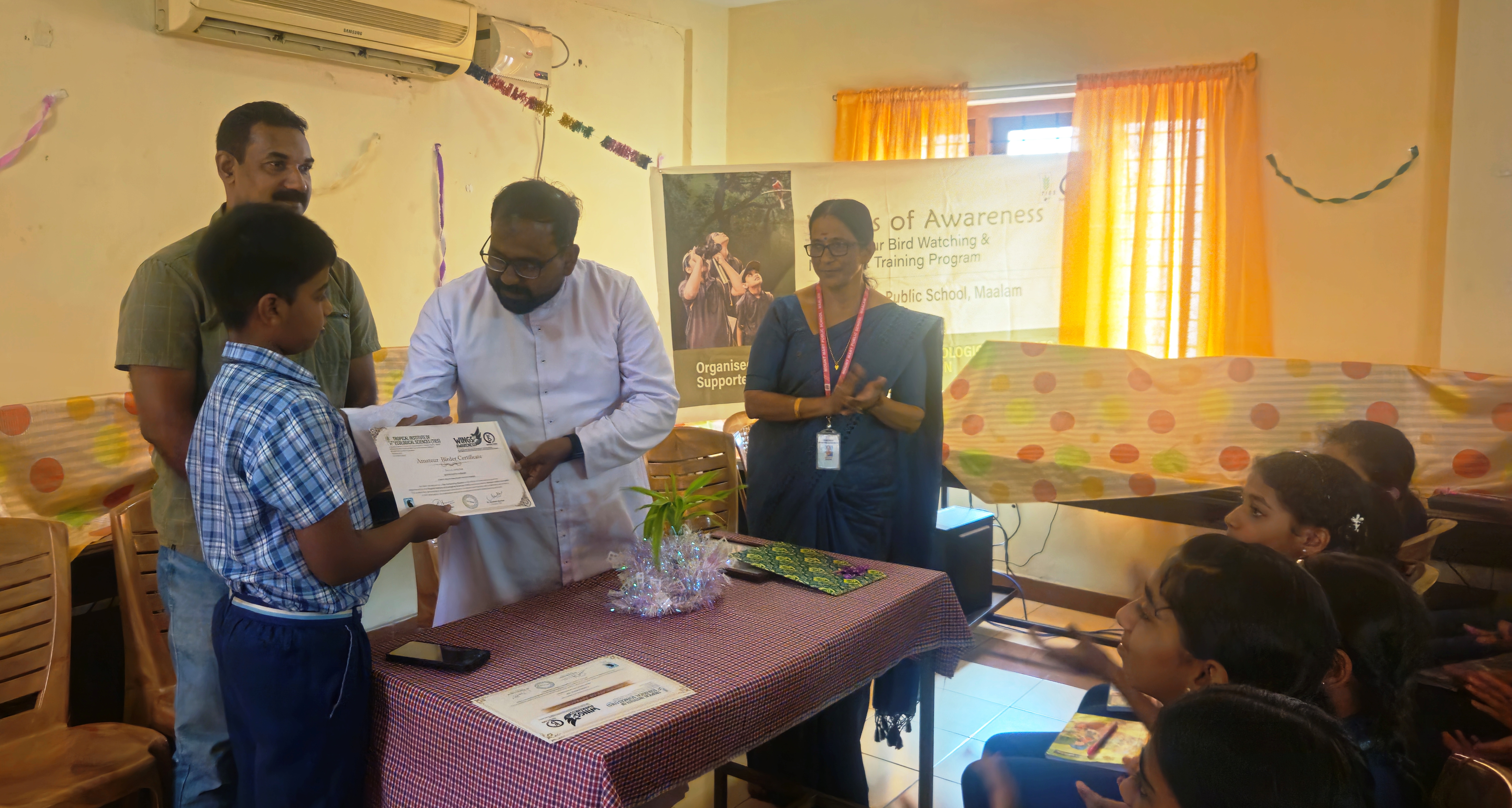 As part of the recognition ceremony, the certificate of participation for the school was formally handed over to the School Manager Rev. Fr. Sam Ottakallil and Principal Mrs. Shila A.D, acknowledging the school’s active involvement in the project. This was followed by the distribution of the “Amateur Birder Certificate” to the top-performing student, Sooryajith Kishor, which was presented by Rev. Fr. Sam Ottakallil in recognition of the student’s excellent performance in the programme activities.