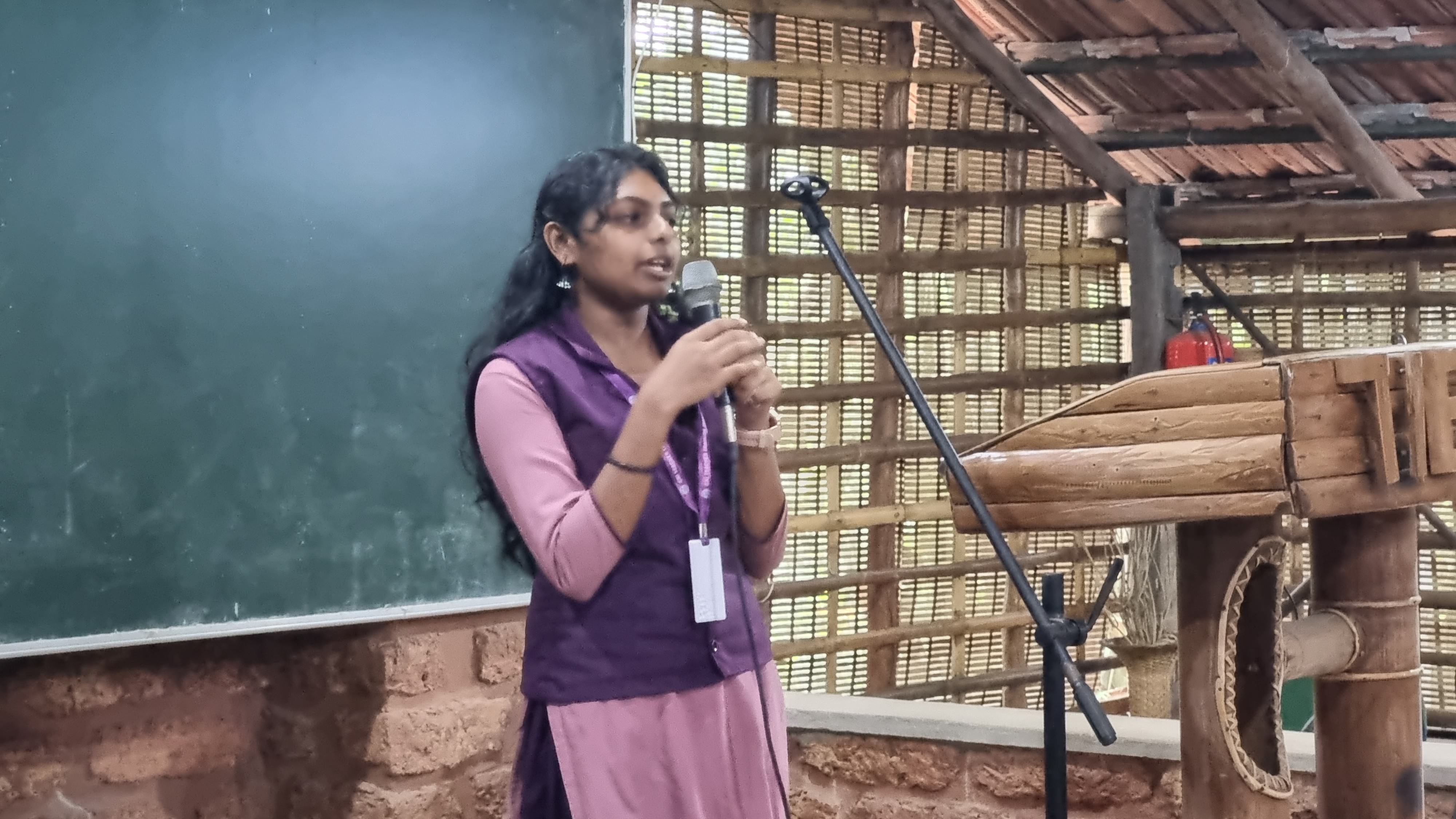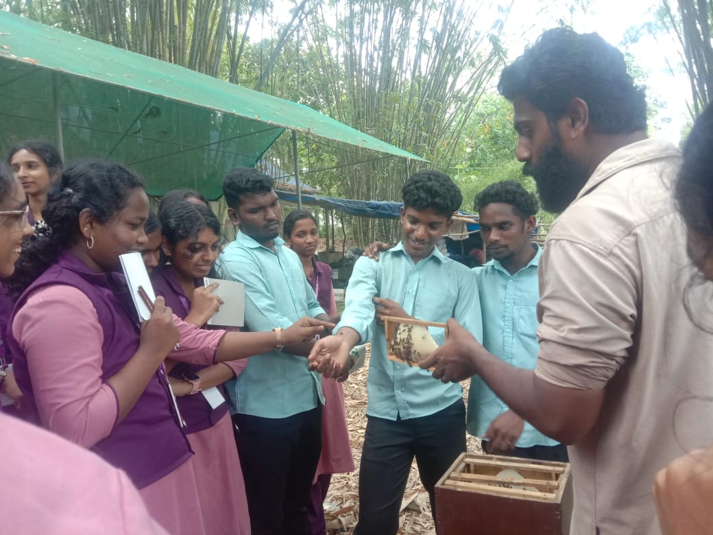 The session was followed by a nature walk through the TIES campus, where students encountered real-world examples of sustainable practices and eco-friendly architectural design. The walk also highlighted the importance of native species in maintaining ecological balance. During the trail, Mr. Sarath Babu N. B., Nature Education Officer, introduced students to apiculture and aquaculture, elaborating on their ecological and economic benefits.