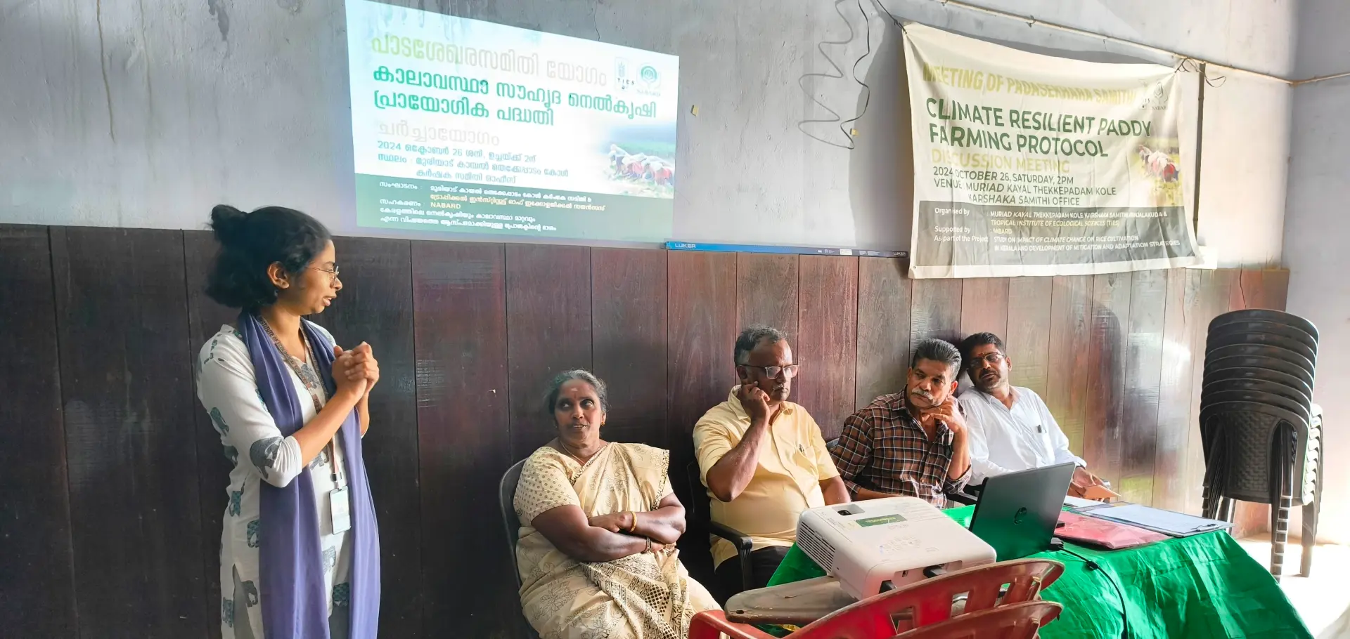 The workshop was presided over by Ms. Nisha Ajaykumar, Secretary of the Samithi, with support from Vice President PR Vijayan, Treasurer Jinu, and 15 local farmers. Ms. Habi Sherin, the Project Coordinator, presented the newly developed climate-resilient paddy farming protocol, while Dr. Punnen Kurian, Secretary of TIES, introduced TIES and outlined the workshop’s goals.