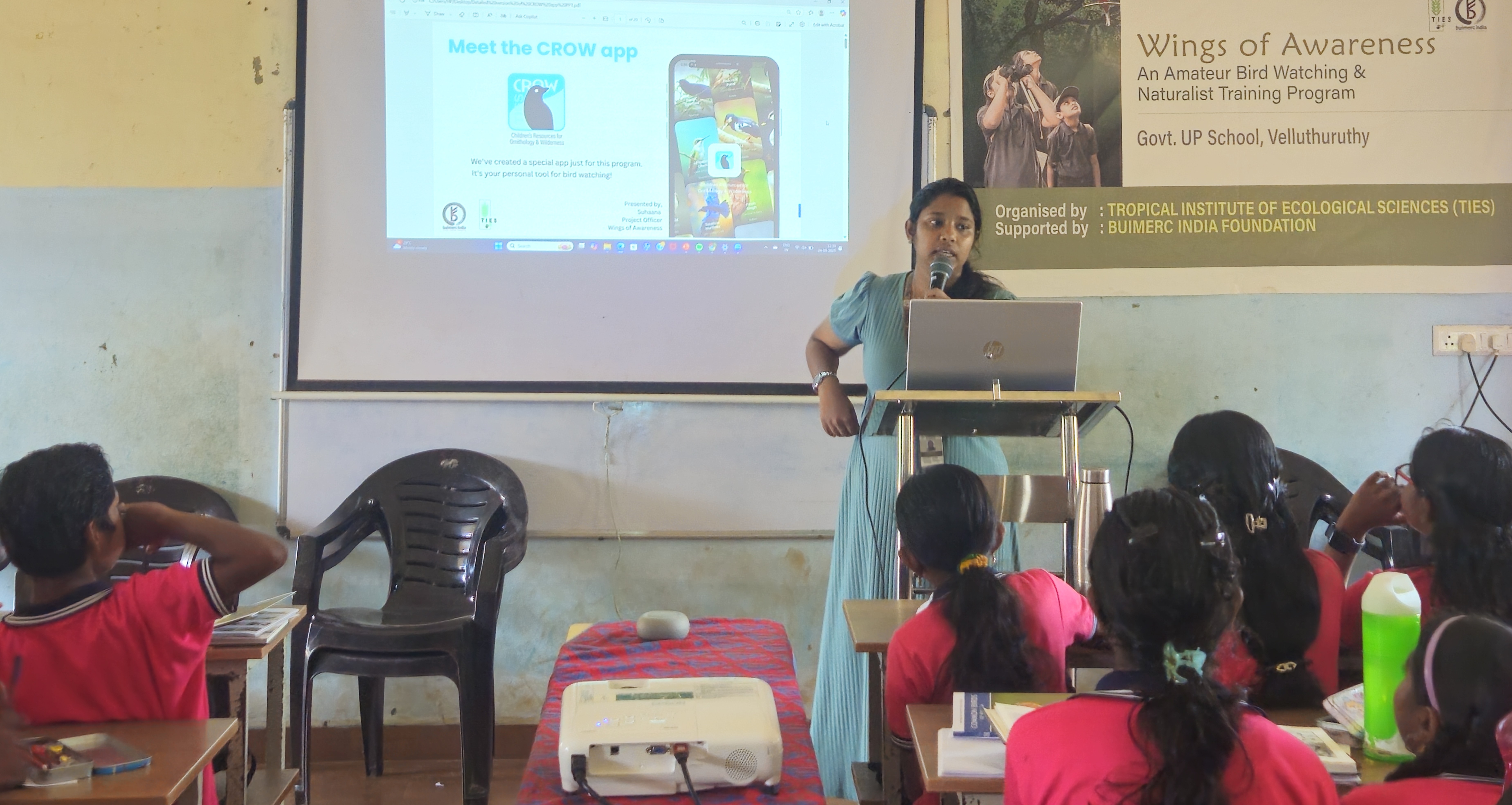 In the final session, Ms. Suhaana, Project Officer of Wings of Awareness, introduced the CROW app (Children's Resources for Ornithology and Wilderness) a digital platform developed exclusively for the project. She demonstrated how the app can be used to record sightings and contribute to citizen science, giving students a modern tool to complement their nature learning.
