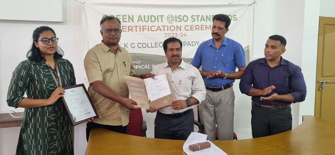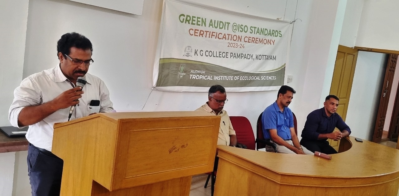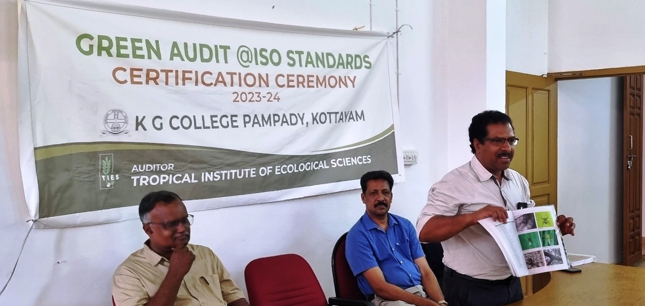 KG College, Pampady has become the first accredited college in Kerala, for Green Audit at international standards. The college successfully completed a comprehensive audit process, assessing its Environment Management System (EMS), Energy Management System (EnMS), Water Efficiency Management System (WEMS), Campus Biodiversity Management System (CBMS), Waste Management System (WMS), and Carbon Footprint (CF).Implementation of these systems aligns with ISO standards, marking a significant milestone for the college. The systems were implemented according to ISO standards for the first time, with certified internal auditors conducting thorough assessments and rectified non-conformities. The external audit, conducted by the Tropical Institute of Ecological Sciences (TIES), an ISO accreditation body, resulted in the issuance of a certificate adhering to ISO standards. Remarkably, the entire process was completed within a tight time frame of three months.