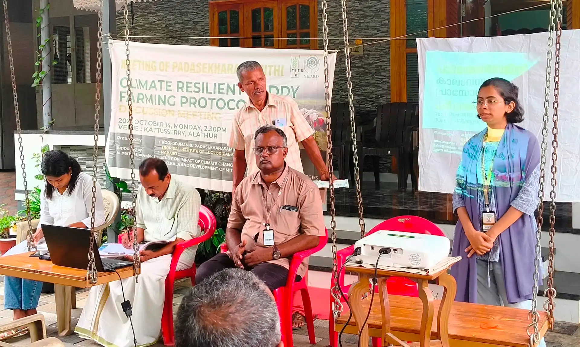 Ms. Habi Sherin, Project Coordinator, delivered a detailed presentation on the newly developed climate-resilient paddy farming protocol which was developed in consultation with paddy farmers, agricultural officers, researchers, etc. Mr. Gouthaman, Secretary of the Samithi, presided over the meeting, stressing the importance of sustainable farming practices. Dr. Punnen Kurian, Secretary of TIES, introduced the institute and outlined the objectives of the workshop. Ms. Shruthy, Alathur Agricultural Officer, and Mr. Anil P K, Agricultural Assistant also attended and provided valuable contributions to the session.