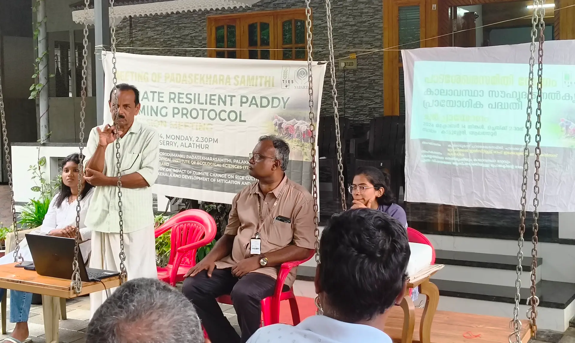 An orientation workshop for paddy farmers took place at Kattussery, Alathur, Palakkad, introducing climate-resilient rice cultivation practices. The workshop was organized by TIES in collaboration with the Koorodmann Padashekhara Samithi, Alathur. This event is part of a series of workshops being held in Kottayam, Thrissur, and Alappuzha under the NABARD-funded project titled “Study on the Impact of Climate Change on Rice Cultivation in Kerala and the Development of Adaptation and Mitigation Strategies.” The project seeks to address key challenges in rice farming by identifying farmers' issues and developing a climate-friendly farming protocol based on successful mitigation and adaptation practices.