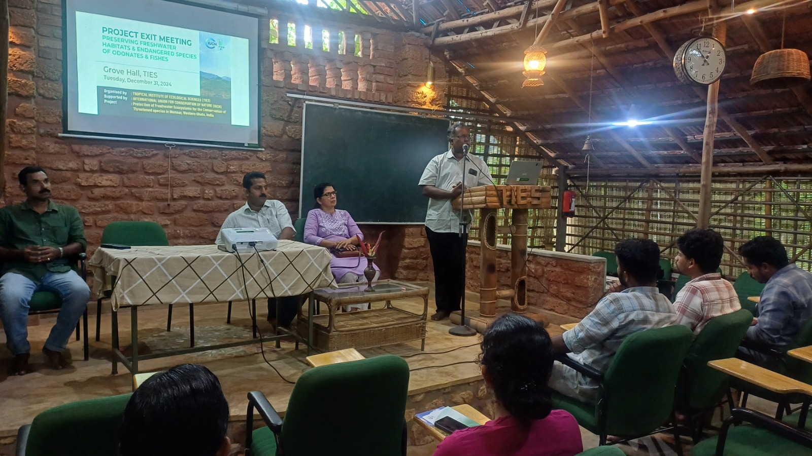 The exit meeting for the IUCN-supported project undertaken by the Tropical Institute of Ecological Sciences (TIES) was held at Grove Hall, TIES. The meeting marked the formal conclusion of the project and provided an opportunity to reflect on its achievements, challenges, and future prospects. Dr. Punnen Kurian, Project Lead, presented a comprehensive overview of the project, highlighting key outcomes such as improved access to clean drinking water for underserved communities, and the establishment of sustainable sanitation infrastructure. The project’s contributions to the conservation of threatened species in the Western Ghats and its alignment with UN Sustainable Development Goals (SDGs), particularly SDG 6, SDG 14, and SDG 15, were emphasized.