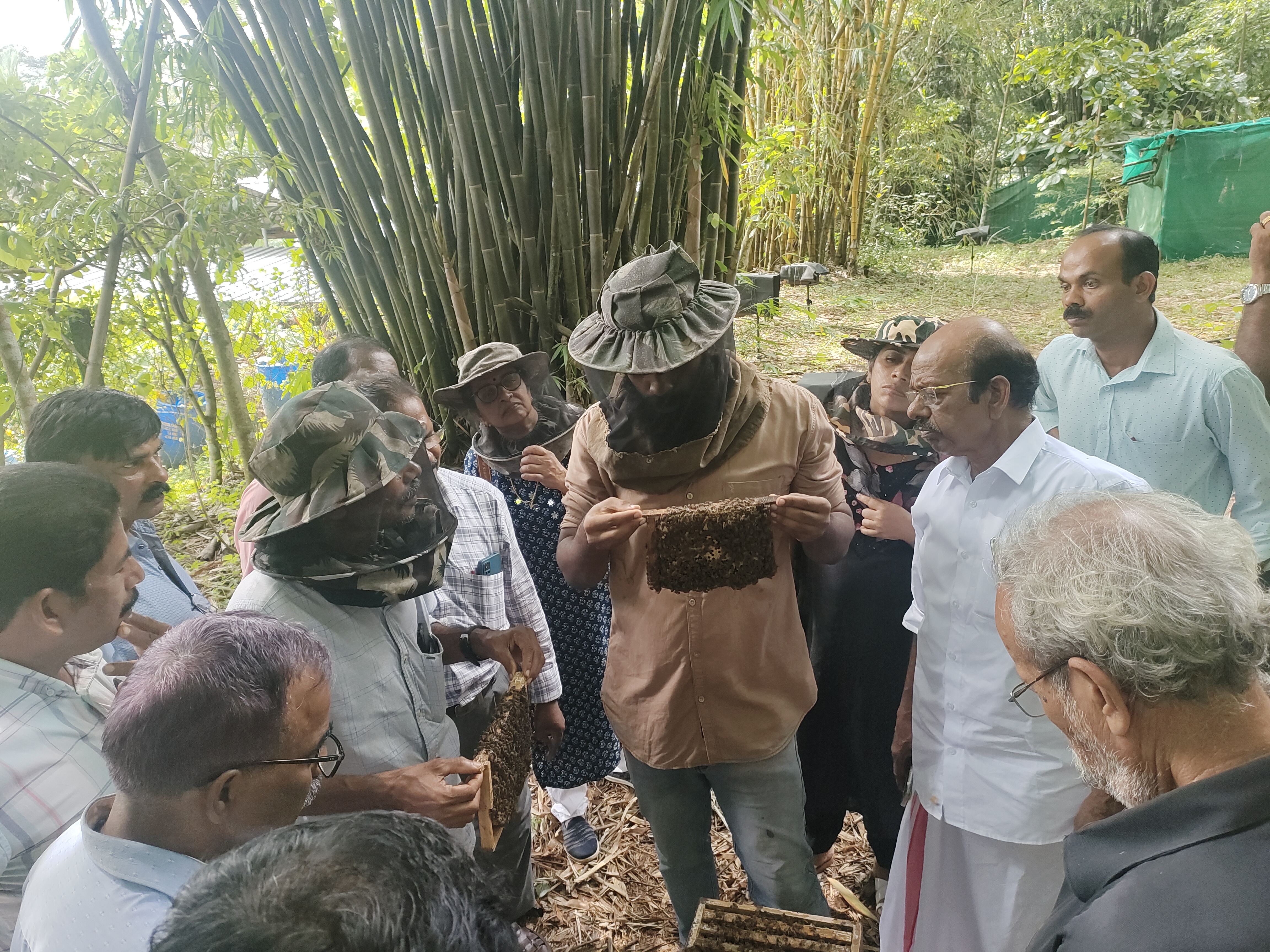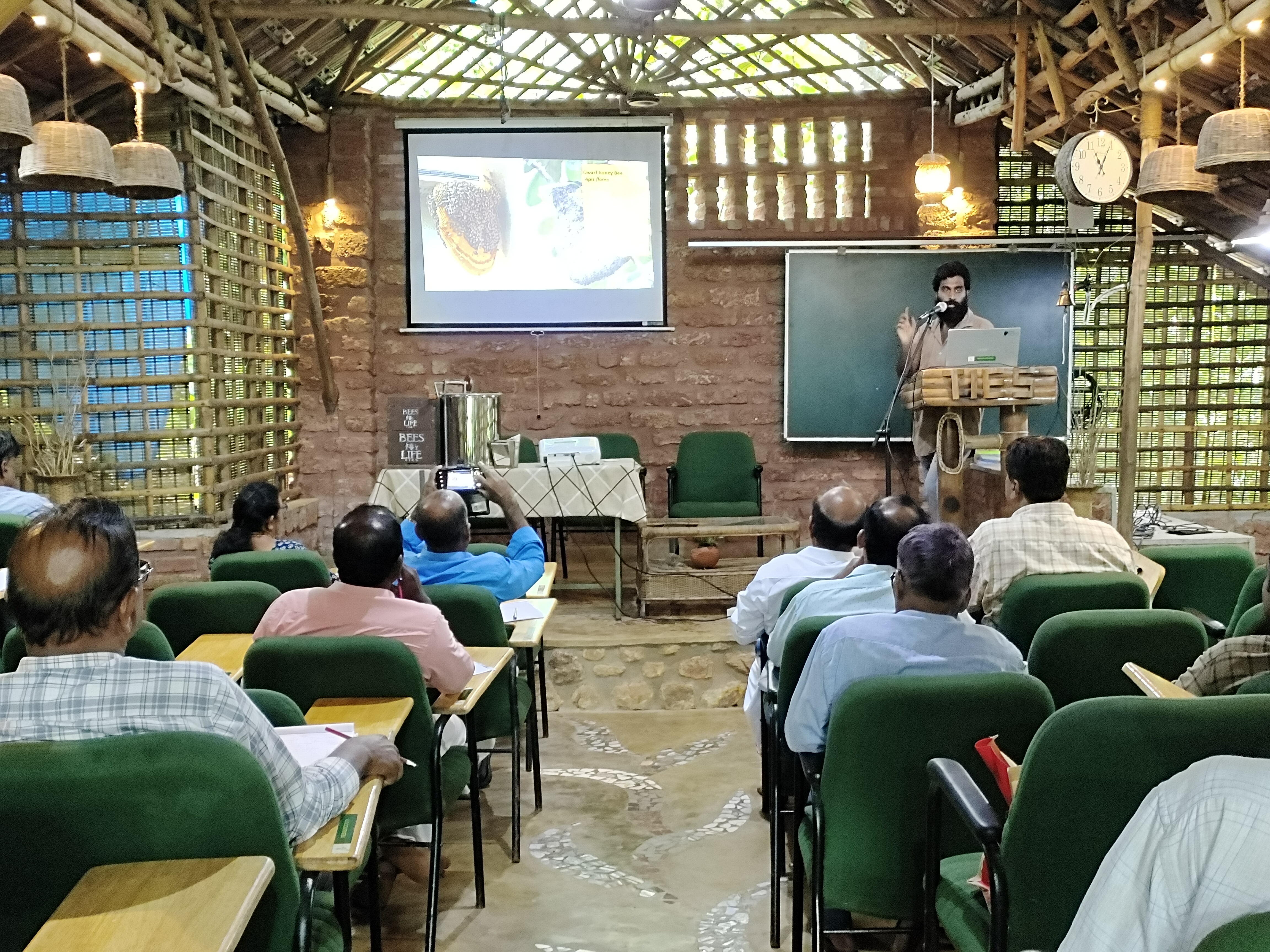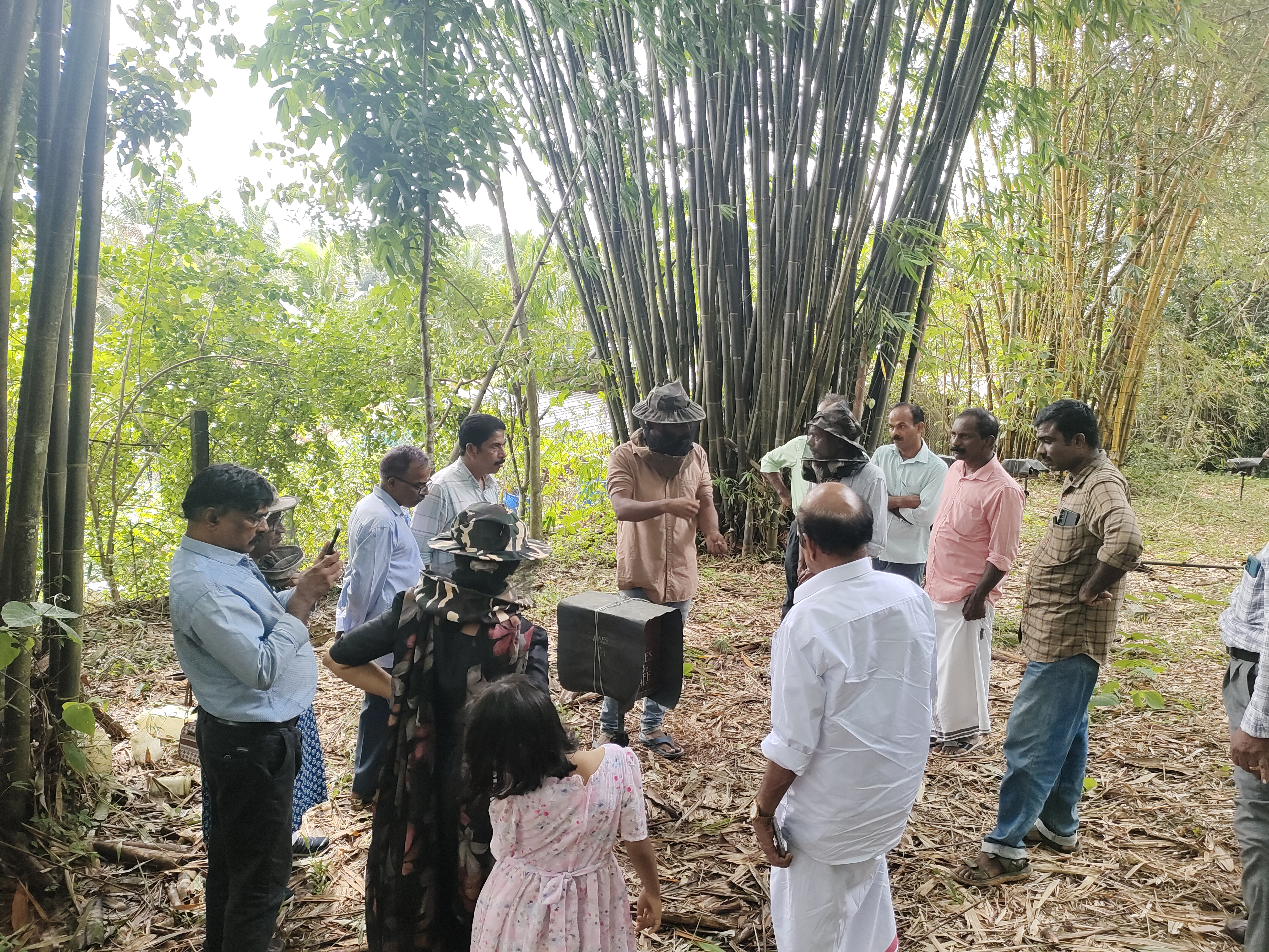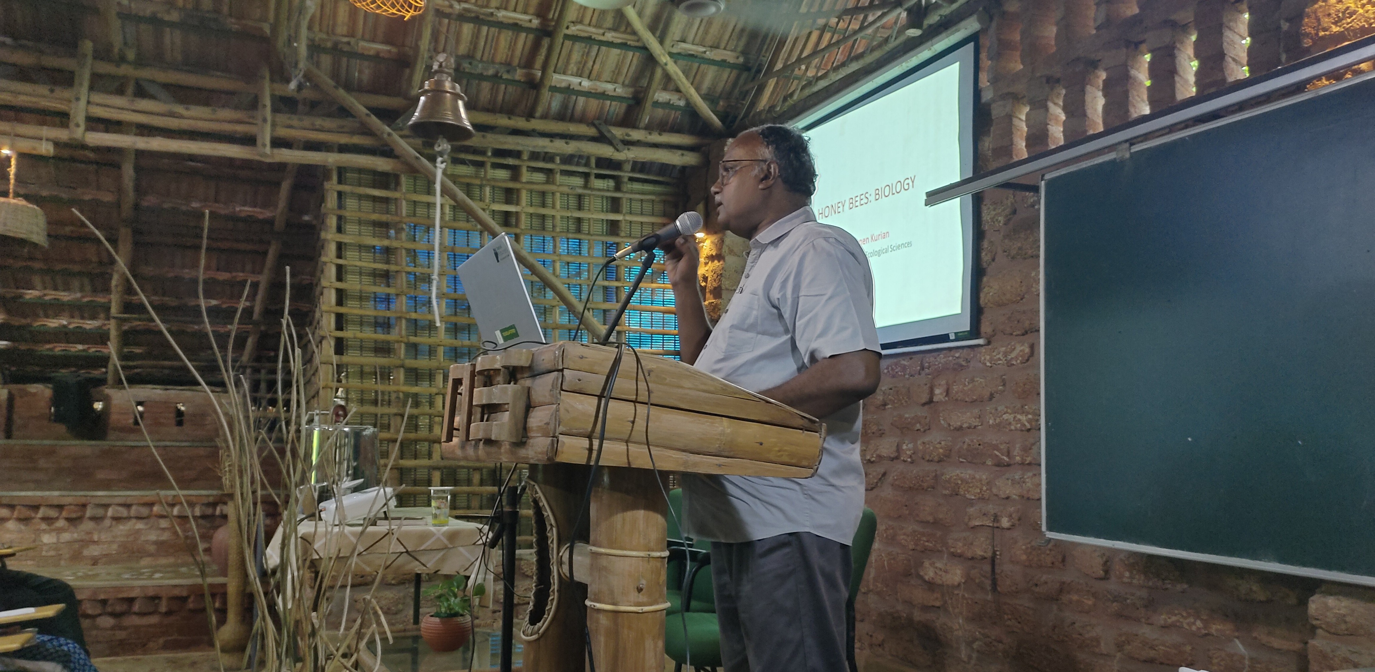 The training commenced with Dr. Punnen Kurian setting the context through a compelling introduction on the ecological significance of honey bees and their indispensable role in natural systems. The session continued under the guidance of Mr. Sarath Babu NB, Nature Education Officer at TIES, who brought the subject to life through engaging visuals and live demonstrations. Topics covered included hive setup, colony division, pest control, honey extraction, and the fundamentals of beekeeping.