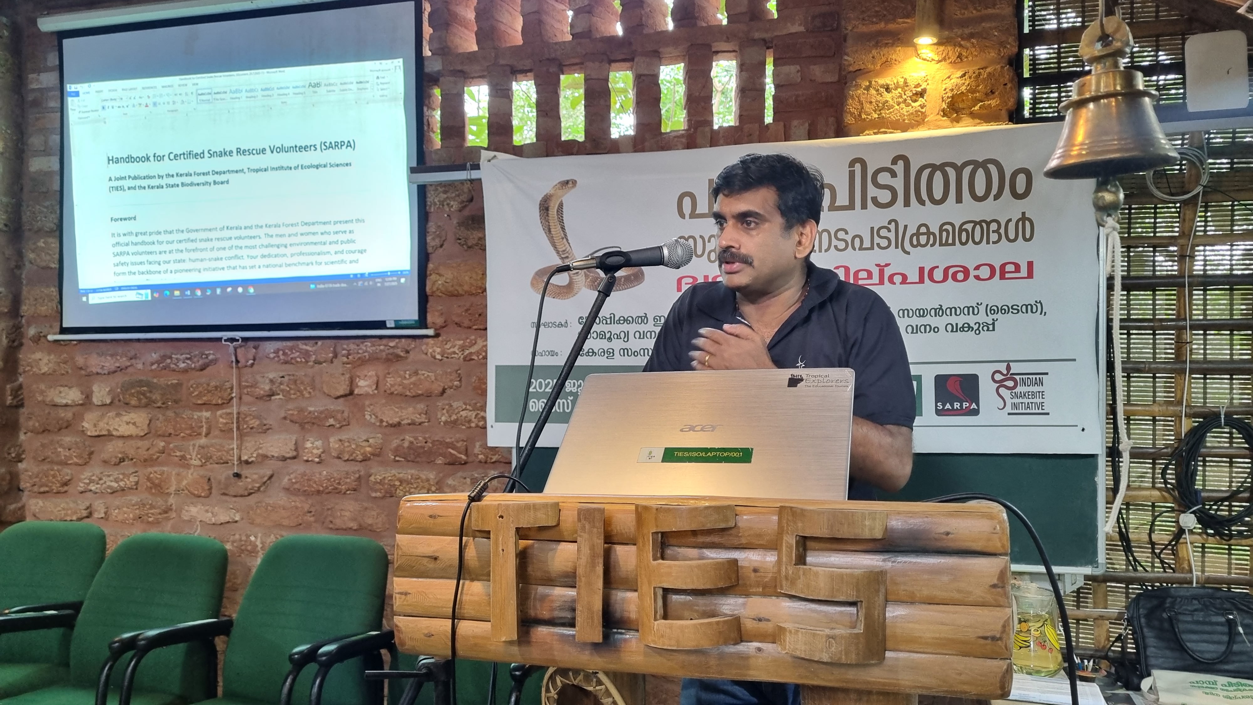 The Tropical Institute of Ecological Sciences (TIES), in collaboration with the Social Forestry Division of the Kerala Forest and Wildlife Department, successfully organized a two-day Workshop on Snake Rescue Protocol for Snake Rescuers in Kerala at the TIES campus in Velloor. The programme, supported by the Kerala State Biodiversity Board (KSBB), has been a pioneering initiative towards developing a comprehensive manual for snake rescuers since its inception in 2020.