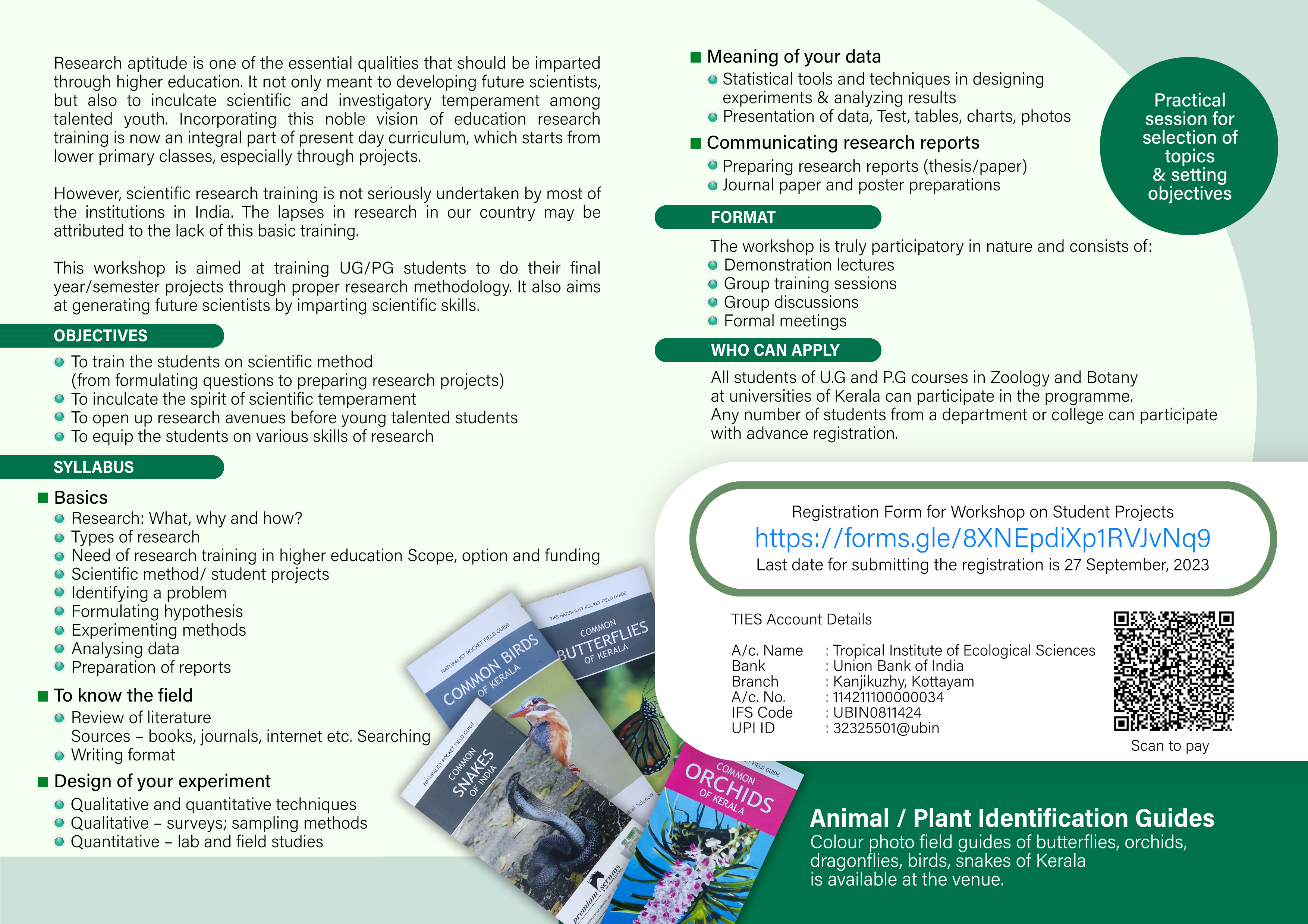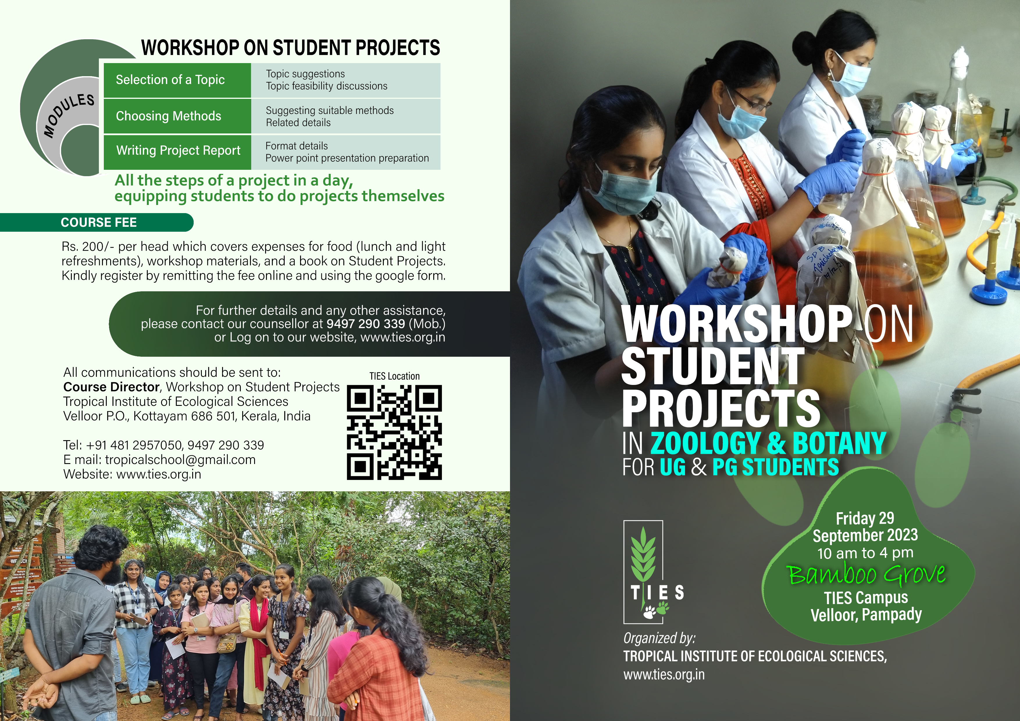 A one-day workshop is conducted by Tropical Institute of Ecological Sciences (TIES) on the Student Project on 29th September 2023. The training also includes practical sessions on the selection of topics and setting objectives. UG and PG students in Zoology and Botany from universities in Kerala can participate in this workshop. The objective of the workshop is to train the students on the scientific method. The fee for the programme is Rs. 200/-. This one-day workshop on student academic project is designed to help undergraduate and post graduate students to assess their current skills and areas for growth, explore potential projects and start one that aligns with their goals.