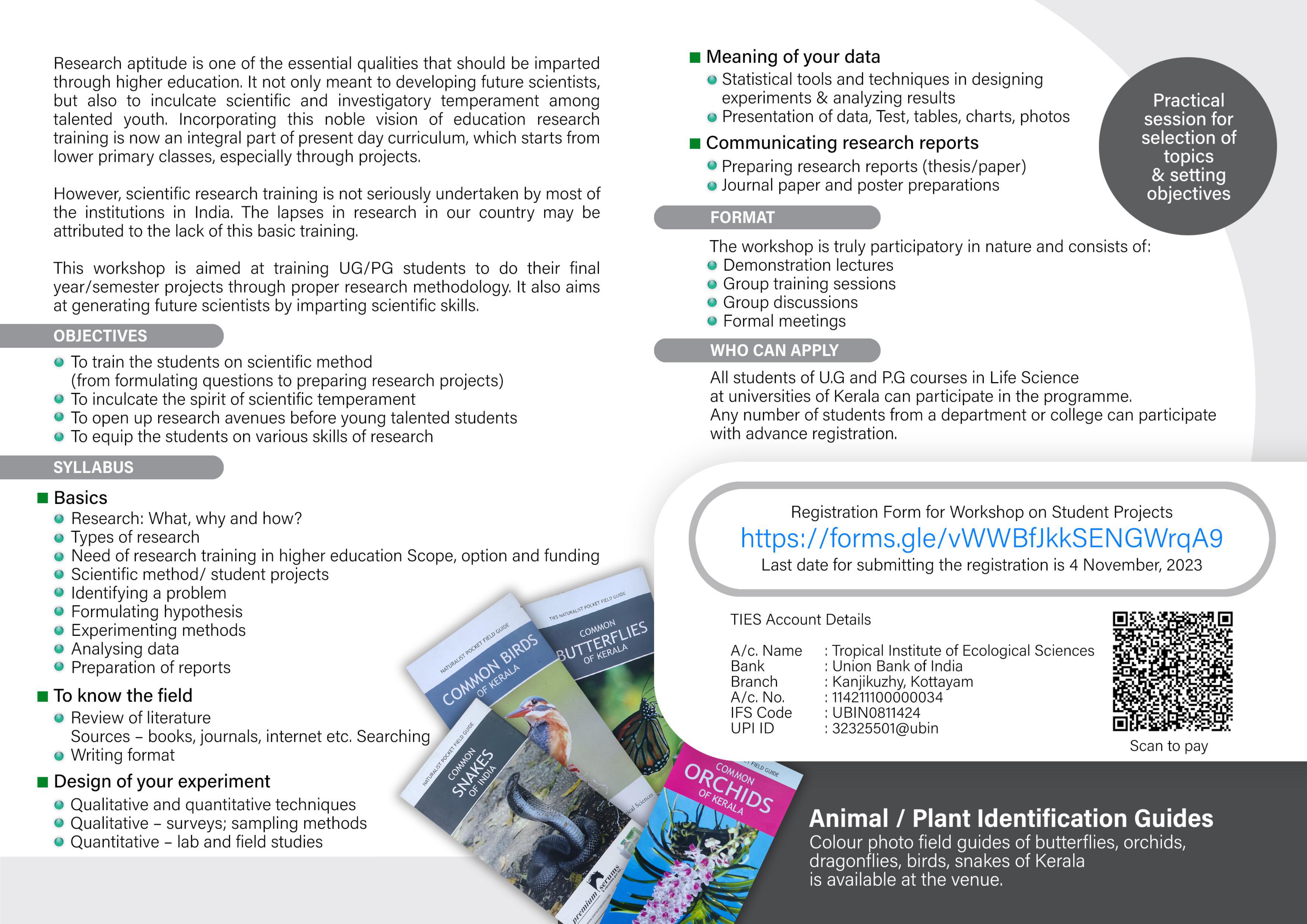 A one-day workshop is conducted by Tropical Institute of Ecological Sciences (TIES) on the Student Project on 6th November 2023. The training also includes practical sessions on the selection of topics and setting objectives. UG and PG students in Life Science from universities in Kerala can participate in this workshop. The objective of the workshop is to train the students on the scientific method. The fee for the programme is Rs. 200/-. This one-day workshop on student academic project is designed to help undergraduate and post graduate students to assess their current skills and areas for growth, explore potential projects and start one that aligns with their goals.