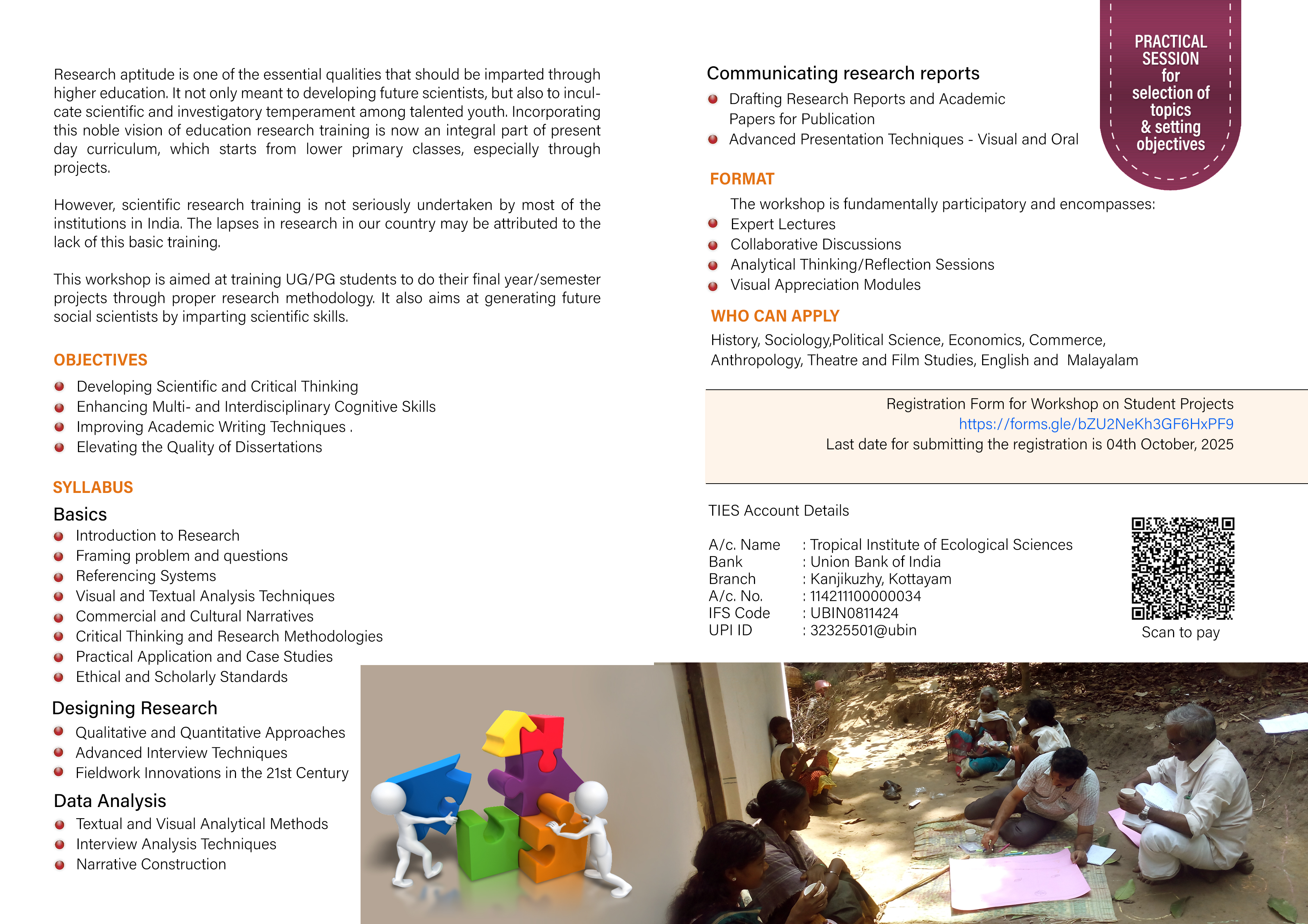 To deepen understanding of technical fundamentals and develop complex skills, students often engage in project-based learning, which encourages problem-solving and critical thinking. The Tropical Institute of Ecological Sciences (TIES) is organizing a one-day workshop on October 07, 2025, specifically for undergraduate and postgraduate students in Social Sciences, Languages, and Commerce. This workshop aims to equip students with the scientific methods necessary for conducting academic projects. It includes practical sessions on topic selection and setting objectives, ensuring that participants gain hands-on experience. The program fee is Rs. 200/-. This workshop is designed to help students evaluate their current skills, identify areas for growth, and embark on projects that align with their academic and professional goals.