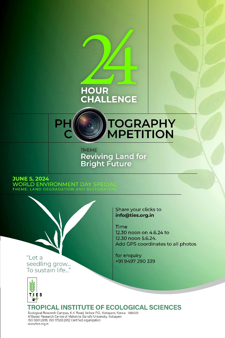 Celebrate World Environment Day 2024 by participating in our photography competition! This year's United Nations theme is "Land Restoration, Desertification, and Drought Resilience." As part of this, TIES is conducting a 24-Hour Challenge Photography Competition. Submit your most compelling images showcasing land degradation and human efforts to restore and protect our planet. The competition is open to all, with exciting prizes for the top entry. Winning photos will be featured online and at major environmental events. Submit your entries by June 5, 2024, at 12 PM and be part of a global movement to raise environmental awareness. Instructions: 1. Sent your entries to info@ties.org.in 2. GPS coordinates has to be shared 3. Name and contact details of the photographer has to be mailed 4. Open for all Capture, share, and inspire—join us in making a difference!